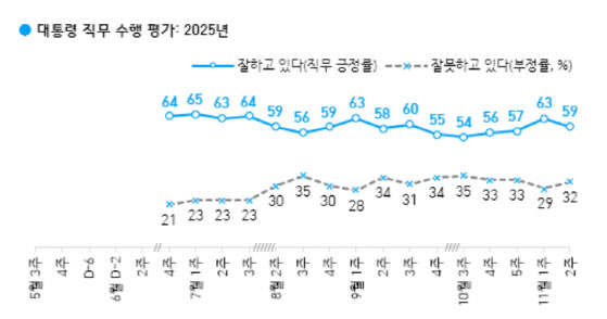 李대통령 지지율 59%…지난주보다 4%p↓[한국갤럽]
